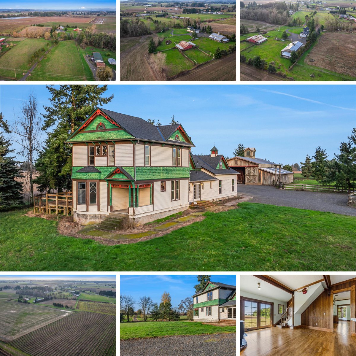 Rare opportunity to own 47 acres of flat farmland just minutes from I-5, offering Mt. Hood views, privacy, and exceptional flexibility for rural living or income potential. A long driveway flanked by hay fields sets a peaceful tone and leads to a character-filled Victorian farmhouse with original details such as stained glass and custom millwork, blended with updates for modern convenience including a kitchen with quartz counters, large island with gas range, and stainless steel appliances. The main living and dining areas open to an expansive deck, and a main-level room offers flexibility as a bedroom or office. Upstairs features three bedrooms and three full bathrooms, an uncommon layout for a home of this era. The property includes multiple independent living spaces, ideal for multi-generational living or rental income. Above the main garage is a semi-finished studio apartment with kitchen, bathroom, private entrance, and potential dedicated garage space. The shop building features a small studio with bathroom at the front, plus a separate two-story apartment built in 1996 at the rear with two bedrooms, two bathrooms, full kitchen, and a large covered patio overlooking Mt. Hood and surrounding farmland. Outdoor amenities include a large shop with a hay loft, a separate barn with stalls and a two-story tack room, and gated pasture, making this property well suited for equestrian use, cattle, or hobby farming. Approximately 35 acres have previously been leased, most recently for blackberries; the lease has been completed and new leasing interest provides flexibility for future owners. Currently under EFU deferral. Non-irrigated but tiled. A unique opportunity to restore, update, and reimagine a versatile rural estate with space, infrastructure, and location that are increasingly hard to find.